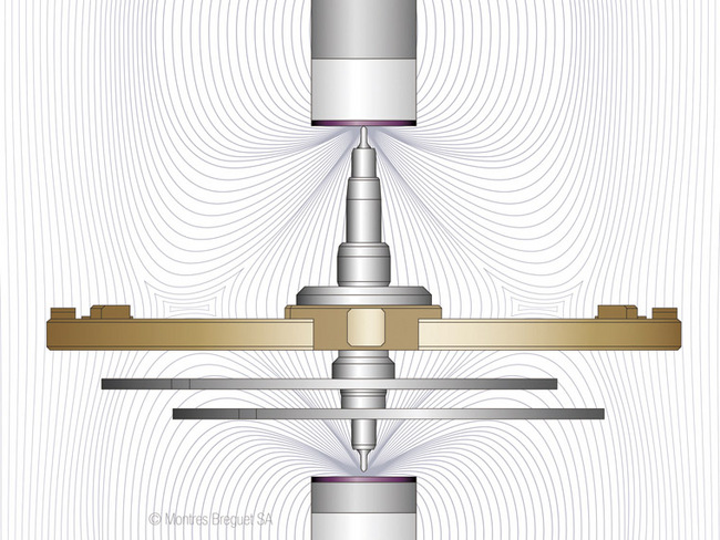 所谓的 Magnetic Pivots 磁力轴承是将原本摆轮轴心上下两端的宝石轴承换成磁铁轴承,这两颗磁铁跟轴心之间还是有隔着一枚宝石,不过宝石跟轴心大部份的时候只维持最小限度的接触。上下两颗磁铁的磁力一强一弱,面盘侧的那颗稍强于表背侧的,因此在表款平放时下摆轮会处于悬吊的状态;另一方面由于上下磁力线的强度落差,位于中间的摆轮轴心也会因此产生磁力,由此轴心就会被固定在叁方所形成的磁场当中。