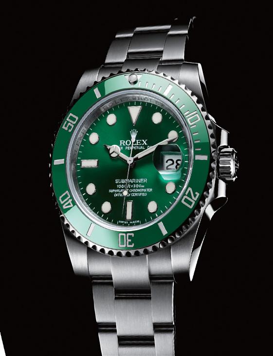ROLEX-Submariner Date 劳力士在C.O.S.C. 认证之外尚有自己 的一套检测标准,因此在6 点方向的 面盘上可以看到更丰富的标示字样。
