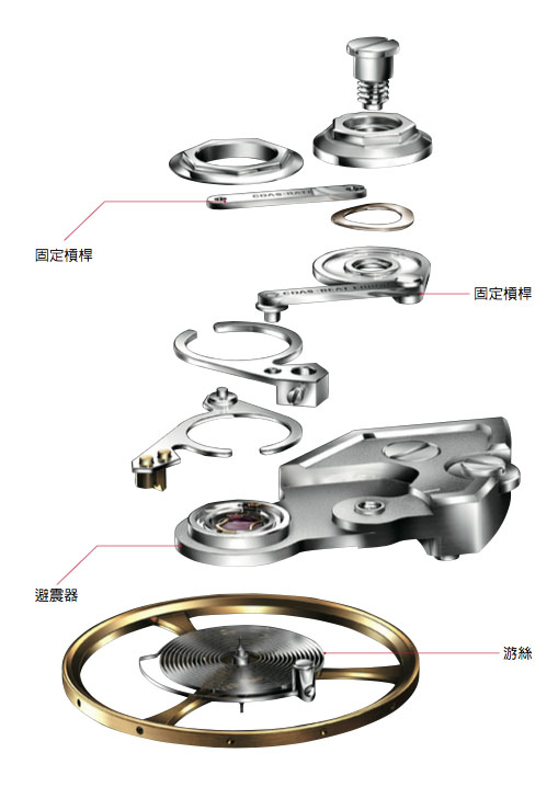 CFB A1000整枚机芯在避震上下了不少工夫,除了自动盘的DSA,它的摆轮组也採用了所谓的CDAS微调。一般的摆轮组至少都会有快慢针和游丝固定桩二个调校点,CDAS(Central Dual Adjusting System)微调系从这二个调校点的尾端延伸出二根槓桿, 再将这二根槓桿锁在摆轮表桥上。这个机构的作用在于可以将快慢针和游丝固定桩锁死,让它们不会因为受到震动而移动位置,进而影响到调教的结果。