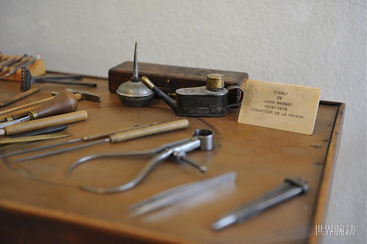 ▲19世纪时欧米茄创办人Louis Brandt在规模简陋的工坊内曾使用的随身制表工具及工作檯被展示于博物馆入口处,揭示着品牌演进的歷史起点。
