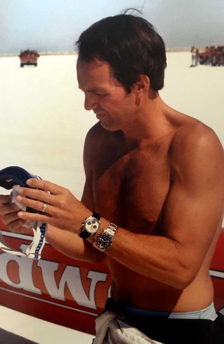 ▲Stan Barrett 1979年嘗試挑戰締造人類首次在陸地突破音速紀錄時,左手一口氣戴了Daytona 6262與GMT-Master 1675不鏽鋼百事圈,前者即為Paul Newman送給他的禮物。Source:watchpro