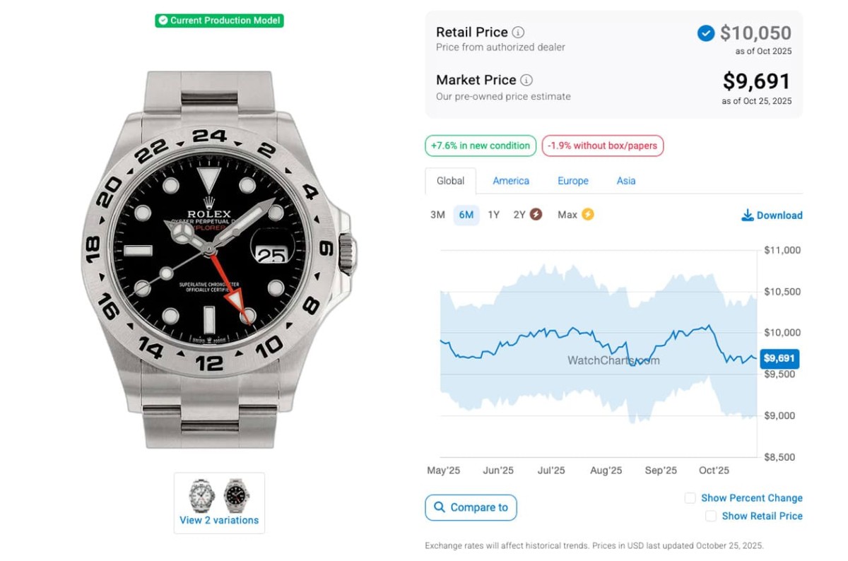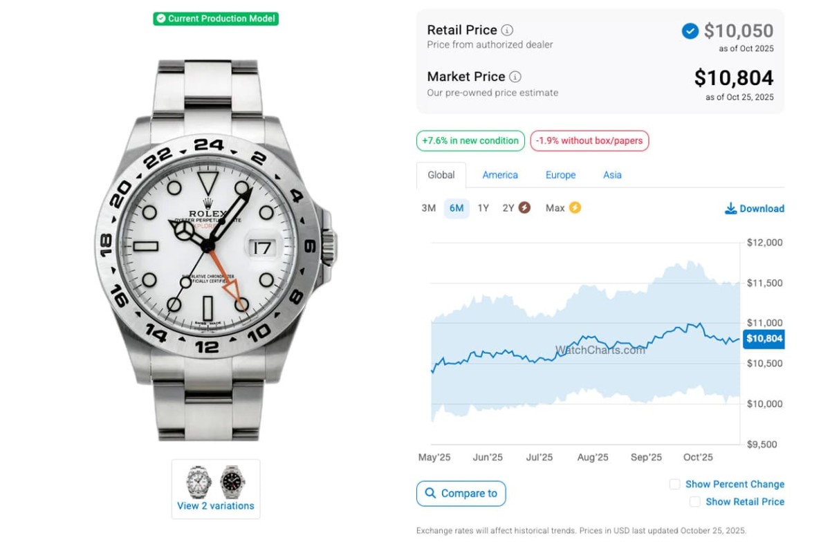 到了2025年10月,同樣由WatchCharts提供的資料可知,白面探二的行情到了2025年3月開始有稍微明顯的成長,最近一個月起起伏伏後回到10,804美金(約合台幣33萬2),屬於半年內的相對高點;黑面探二則是半年內的前半段開低走高,2025年4月時曾突然暴漲一波,結果5月開始又繼續下墜,6月又再漲一波上到7月又降溫,延續至8月還是有再往下,9月一度衝破1萬美金關卡,到了10月又跌破這條線,起伏顯得較大,如今二級市場價格為9,691美金(約合台幣29萬7)。白面探二大致維持系列近年來的表現,就是略高於定價,但是溢價率並不算非常驚人,至於黑面探二身價前兩個月雖然有所成長但沒多久又走跌,目前還是處於定價線之內。目前白面探二的溢價率為7.5%%,看來黑面探二在日內瓦鐘錶與奇蹟錶展過後新款明朗化後,國外二級市場的行情又開始校正回歸,如今市場上大概能用30萬台幣左右的價格入手這款實用耐操的作品,即使它們不是特別熱門,但也不失為接觸勞力士運動錶物有所值的敲門磚選擇。