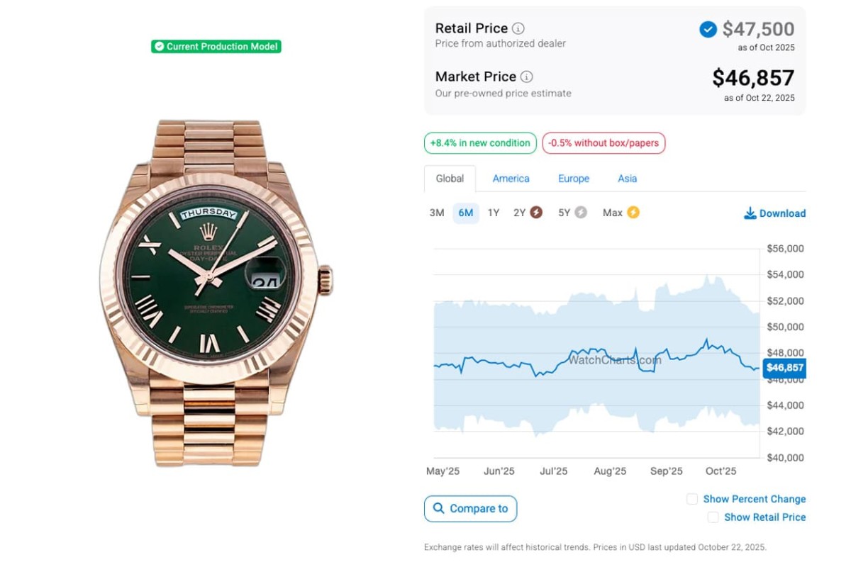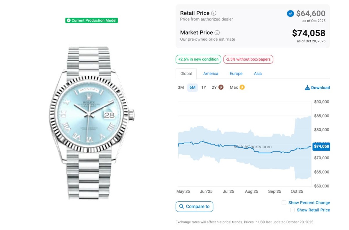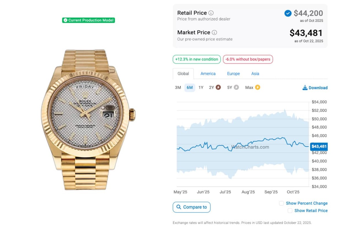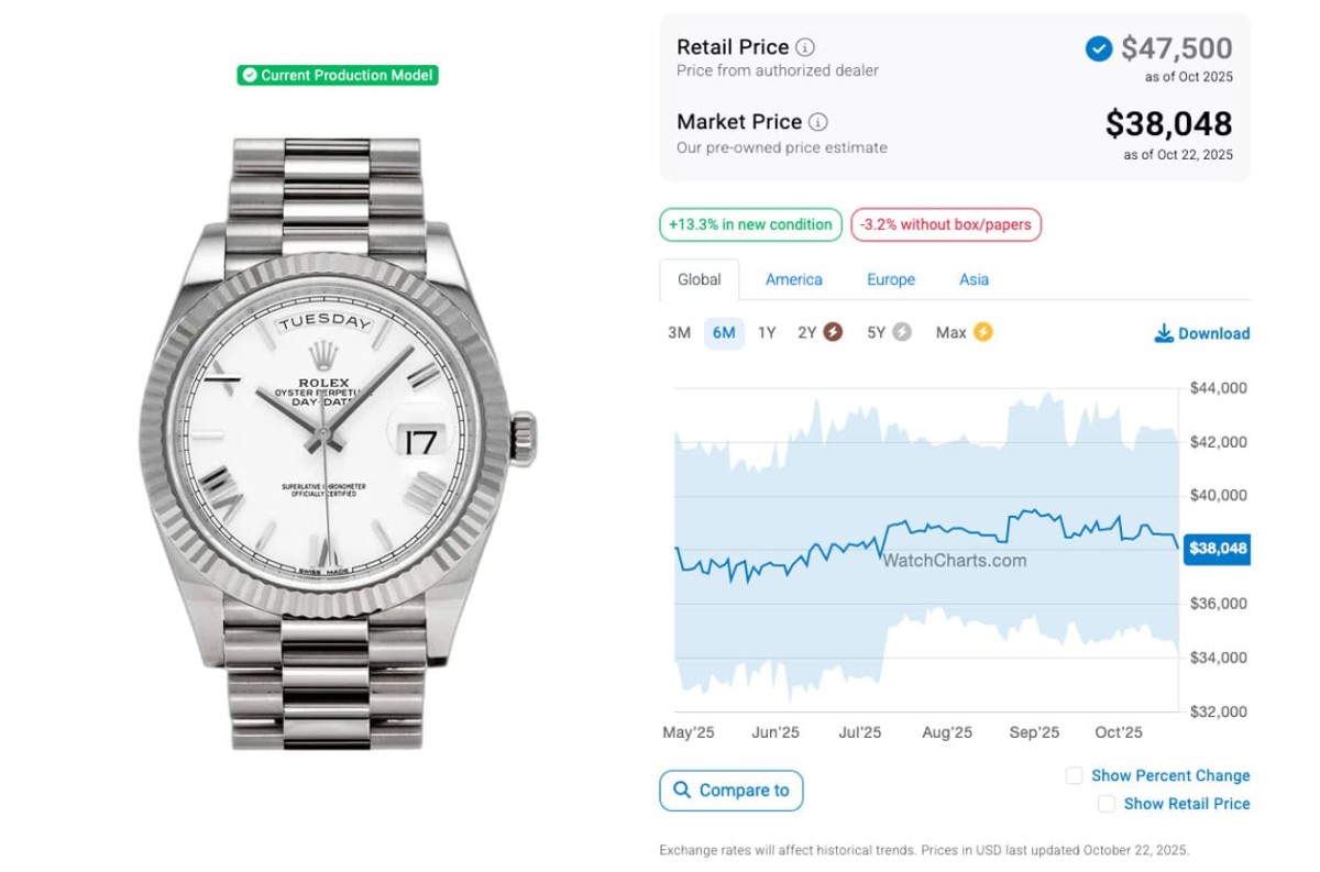 轉眼到了2025年10月,過去半年以來,Day-Date 40mm的二級市場價格有起有落,不同材質之間有各自的發展,其中鉑金款的發展有點戲劇化,原本去年12月它的行情開始一瀉千里跌到該年的谷底,可是從12月中後至2025年2月又突然氣勢如虹成長至2024年10月以來的高峰,然後在那之後又有點疲軟下滑,尤其是4月時跌到今年谷底,近幾個月來略有起伏之後一度降至比4月時更低的價位,不過10月以來又有起色開始往上爬。而一向行情較差強人意的白金款,在2025年1月已開始連流在低檔,可是到了2月後突然衝上來,行情維持到5月,至7月為止又有比較明顯的下滑,可是進入到8月後又再升起,至9月中旬後迄今一路起伏後又再回跌。同樣根據WatchCharts的資料,黃金、永恒玫瑰金、白金與鉑金Day-Date 40mm如今的行情依序是43,481美金(約合台幣133萬8)、46,857美金(約合台幣144萬2)、38,048美金(約合台幣117萬)和74,058美金(約合台幣228萬)。現在已經只剩鉑金款處於超定價,其他三款在本月甚至更早前都已經在定價以內。