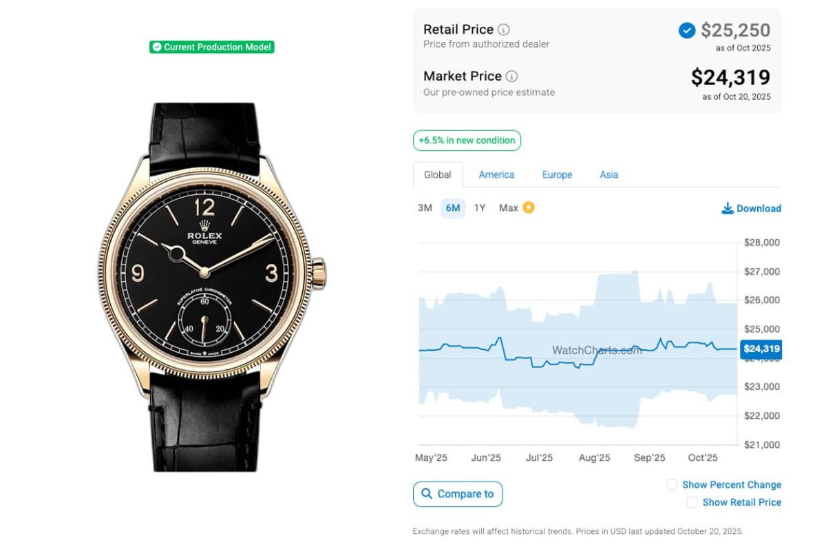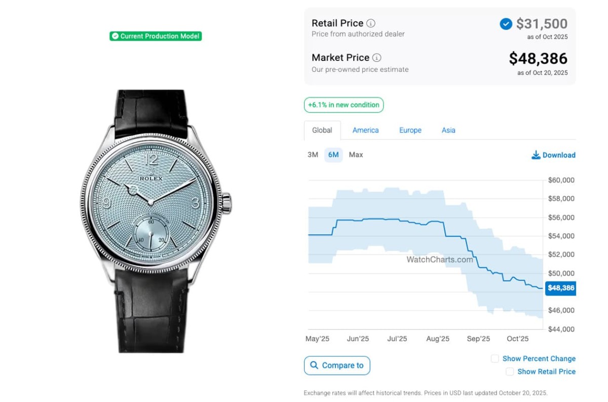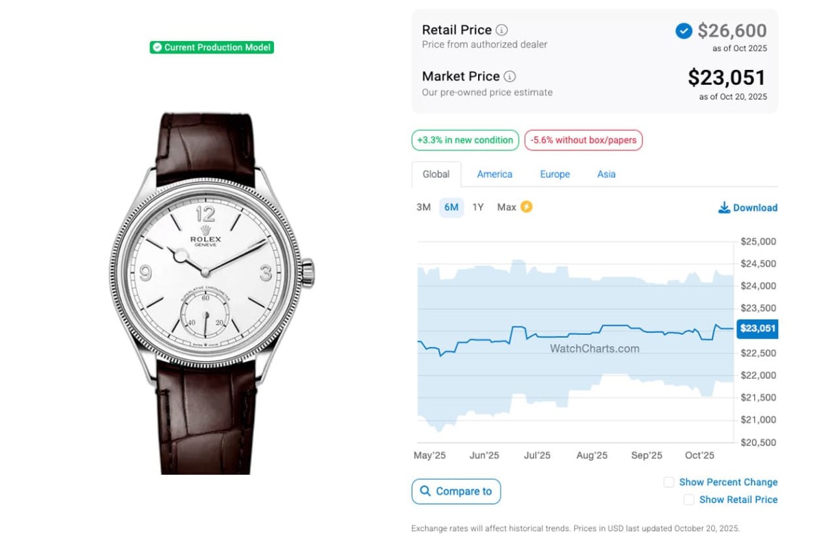 根據高級手錶市場調查研究機構WatchCharts的資料,1908系列的發展似乎慢慢走上Cellini系列的舊路,因為在2025年4月時,當時黃金材質的52508二級市場價格約為24,264美金(約合台幣74萬5)、白金材質的52509行情則是22,767美金(約合台幣70萬),至於鉑金材質行情還很驚人有54,128美金(約合台幣166萬3),先出的兩款當時都已跌破定價,主要因為那時候1908系列已經不算新,至於晚一年出道的鉑金冰藍面還在享受蜜月期的紅利,溢價率是此系列的標竿;又過了半年後的現在,若對照勞力士其他熱門錶的情況而言,1908系列的行情應該也是持續往下走才是。