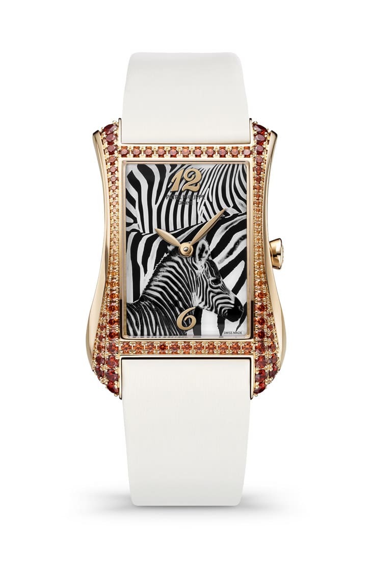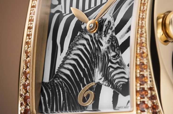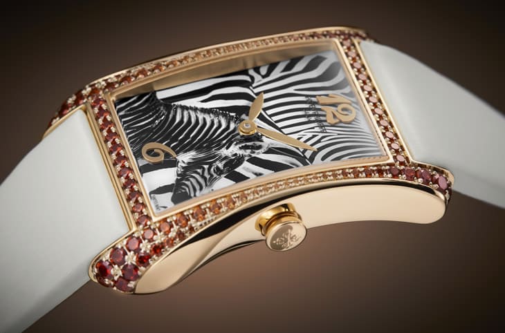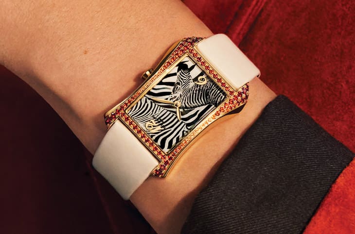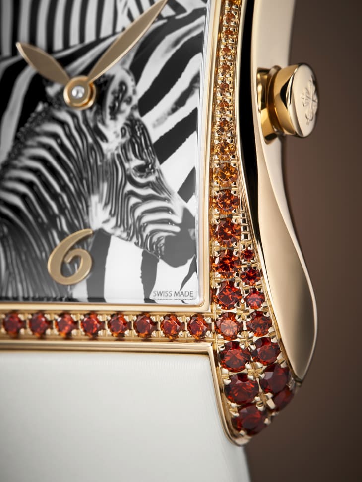 18K玫瑰金材質/石英機芯/時、分顯示/雕刻、清漆裝飾斑馬圖案面盤/錶款鑲錳鋁榴石94顆,約重2.02克拉/藍寶石水晶鏡面/防水30米/錶徑40.85x28.6mm/參考價:NT$ 1,387,000