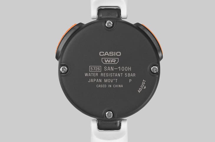 除了耐熱,卡西歐在防潮設計上也毫不妥協,SAN-100H採用低透濕性的樹脂錶殼,有效避免內部起霧,錶背則採特殊結構,防止螺絲與皮膚接觸,即使長時間佩戴也能保持舒適,手錶具備50米防水、電池壽命約5年,兼顧日常使用與三溫暖需求。