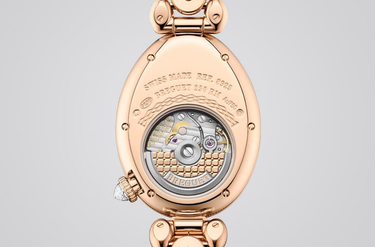 寶璣在美學之外,同樣注重機芯的精準與穩定。9935搭載537L2自動機芯,震頻3.5Hz,動力儲存約45小時;8925則配備586/1機芯,震頻3赫茲,續航38小時。兩者皆蘊含矽質擺輪游絲,具備抗磁與抗溫差的特性,確保長期穩定運作。透過背面局部透明的藍寶石底蓋,可欣賞鍍寶璣金的鉑金自動盤,上頭以手工機刻雕花刻出Petit Trianon圖案,靈感來自小提亞農宮的花園,底蓋上則鐫刻"BREGUET 250 YEARS"字樣,為這次紀念之作畫下專屬印記。