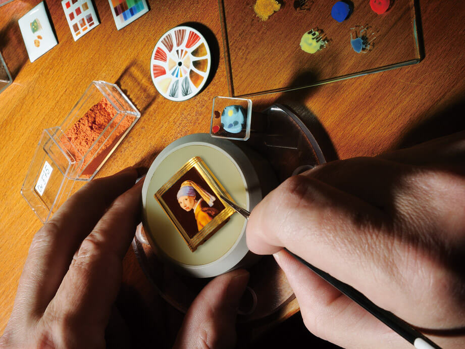 微縮彩繪琺瑯(Enamel Miniature)簡稱微繪琺瑯,也叫做畫琺瑯,是時計藝術化的極致展現。作法為工藝師先在金屬胎體上塗覆幾層白釉形成類似「畫布」的功用,後續便如同繪製油畫作品般直接構圖、上色與燒結。看起來似乎平凡無奇,但微繪琺瑯反而是三種技法中困難度最高的一項,因為它不只講求工藝層面的熟稔度,還需要工藝師帶有幾分藝術家的美學天份;一般來說微繪琺瑯的作品主題多為世界名畫,要將之「濃縮」至錶款的面盤中,該如何掌握畫作重點與原作者的畫法派別對工藝師而言充滿極大挑戰。微繪琺瑯約起源於15世紀中葉歐洲比、法、荷交界的Flandres區,不過在15世紀末時原本以內填琺瑯為主的法國Limoges區開始發展成畫琺瑯的重鎮。