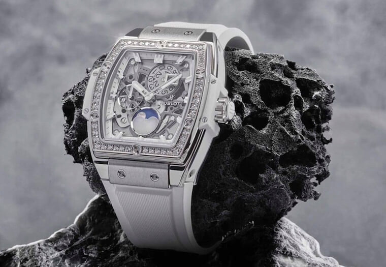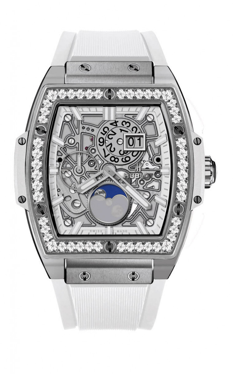 钛金属材质/HUB1770自动上链机芯/时、分、小秒、大日期显示/月相显示/表壳镶钻48颗,约重0.58克拉/蓝宝石水晶镜面、透明底盖/防水100米/表径42mm/参考价:NT$ 749,000