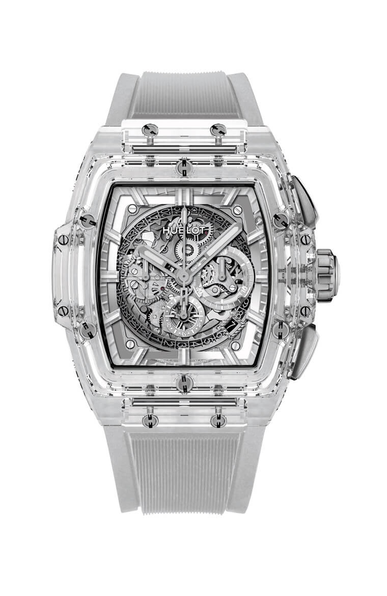 蓝宝石材质/HUB4700自动上链机芯/时、分、小秒、日期显示/计时码表功能/蓝宝石水晶镜面、透明底盖/防水50米/表径42mm/限量200只/参考价:NT$ 2,453,000