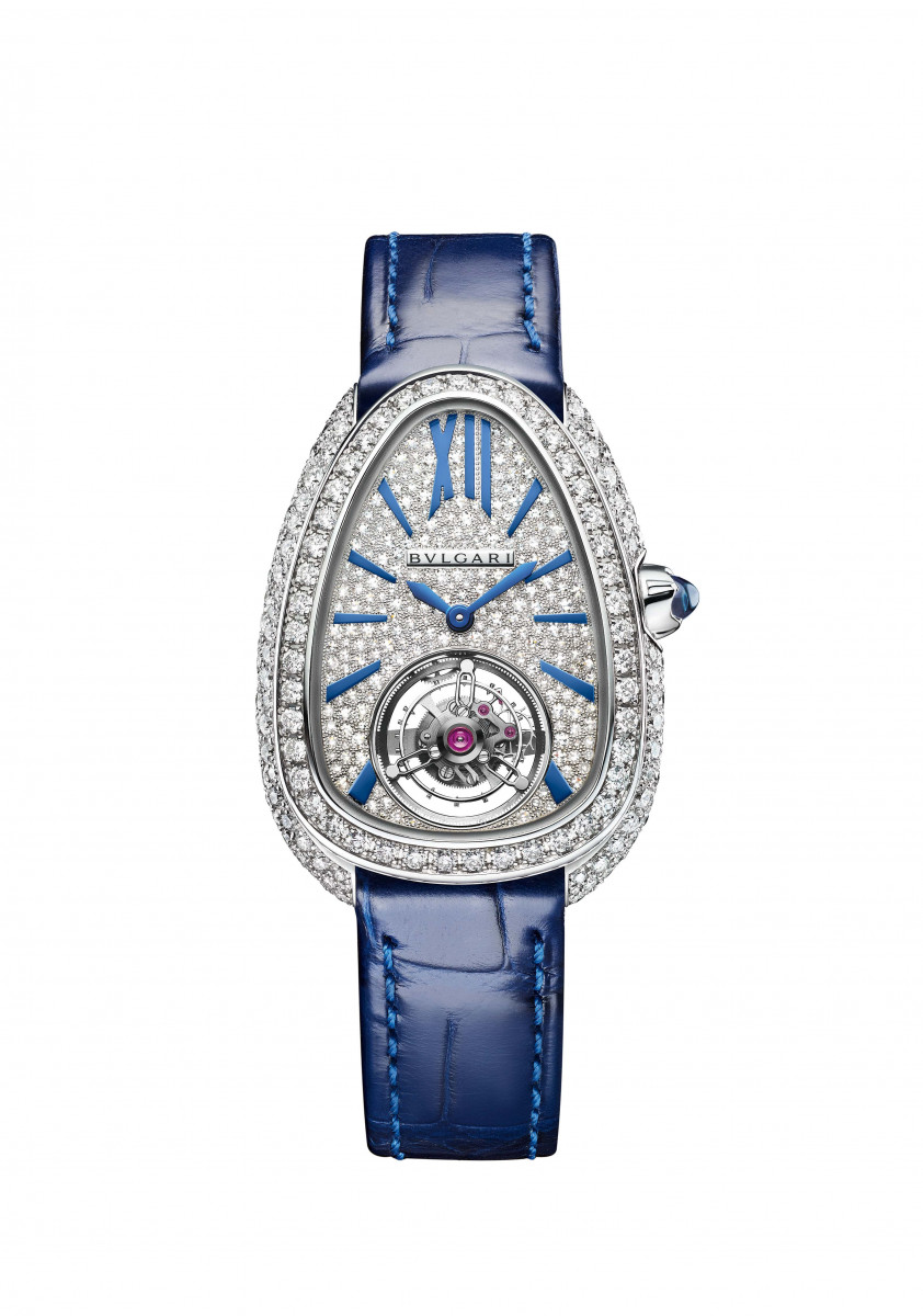 Serpenti Seduttori 2019年推出时,重新演绎品牌最具代表性的Serpenti系列,打造出生而为金的崭新款式设计。如今,Serpenti Seduttori延续这段旅程推出新款作品,内建女表少见的小型陀飞轮机芯BVL150,也是市面上小型陀飞轮的巔峰代表(机芯尺寸仅为22x18mm),复兴了1970年代初期被石英机芯所取代的小型机械机芯传统。