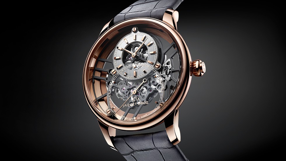 新作其中一款配备玫瑰金表壳拥有精致、温暖的铜色光泽,是雅克德罗钟爱的合金。手表搭配採用新型饰面的橡胶触感皮革表带,为品牌经典的半雾面鱷鱼皮表带增添一重变奏。表带的灰色调与悬空固定精致大秒针机芯的表桥顏色相同。