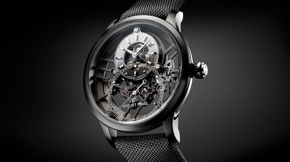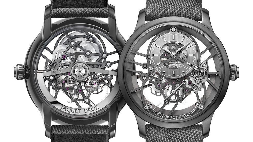 另一款新作更特别了,雅克德罗首度採用等离子陶瓷。这种陶瓷是通过20000°C下激活的气体,基于白色陶瓷转变而成。其特点是呈现金属光泽,而未在其成分中添加任何金属元素。这种转化工艺保留了陶瓷的所有固有特性。其具备经过充分验证的高科技陶瓷同等的硬度、轻盈度及耐刮擦性能。全新深灰色等离子陶瓷表壳搭配动感时尚的灰色帆布表带。