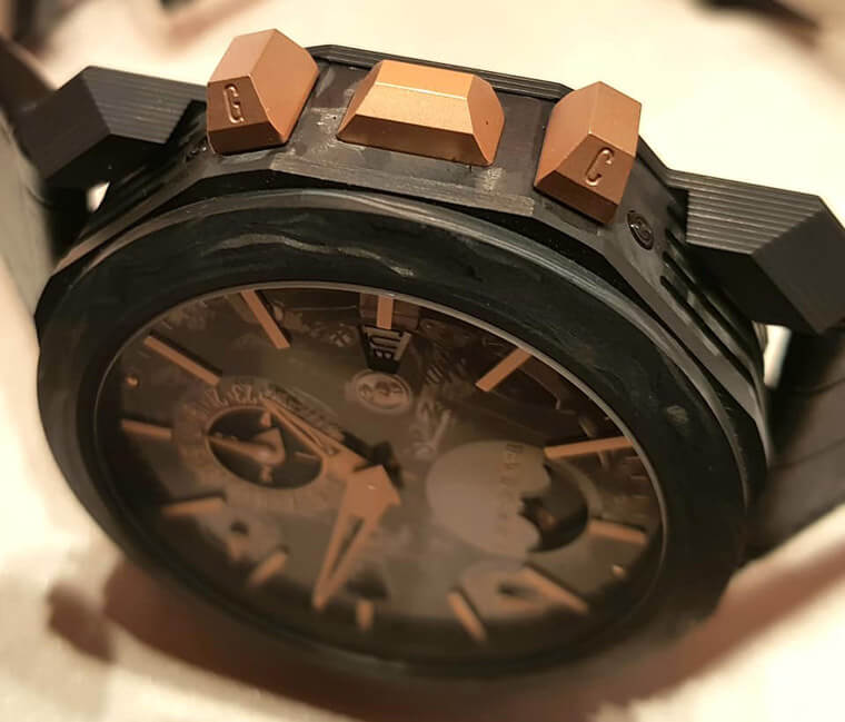▲手表表壳以碳薄层(CTP)材质制成,视觉上带有叠层和不规则纹路之外,亦有极致轻量化的效果。