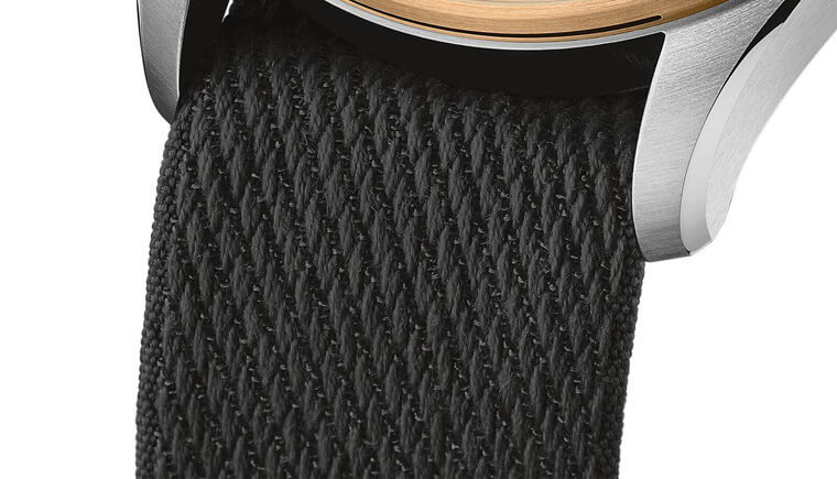 ▲手表採用法国百年厂商制作的NATO表带,强调以手工制作提升其外观精致度以及实际触摸质感。
