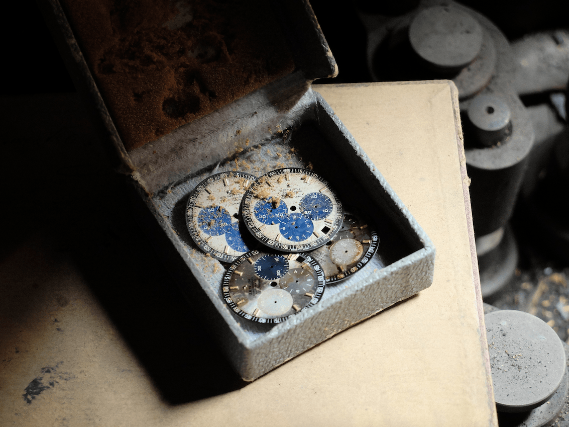 ▲1970年代石英危机时期,查理.维尔莫在阁楼掩藏了不尽其数的制作传奇机芯El Primero的图纸、重要零件和保存完好的工具。其中,工作人员发现了一个未贴标籤毫不起眼的小盒子,盒内存放着的是许多历经数十年光阴洗礼的面盘。