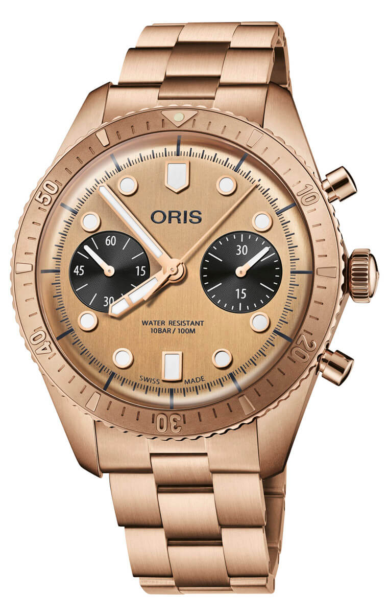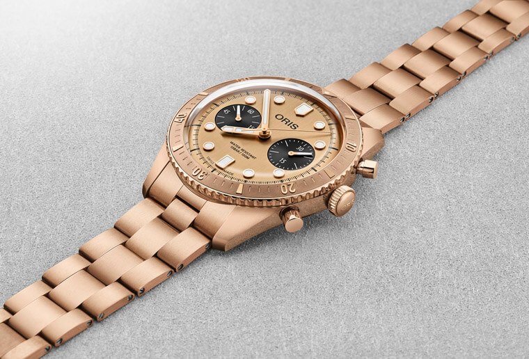第一款Hölstein 2020限量计时码表是一款採用青铜表壳的作品,你可能会觉得ORIS出青铜表不算什麼特别的是,的确,品牌自从2016年初次贴近时势打造入门价位的青铜表(Carl Brashear限量表)后,几年下来ORIS已经是消费者想以亲切价位购入青铜表的优先选择之一,因为品牌陆续推出青铜或是半铜手表,让对于这种材质感到好奇的人得以不需花到3、40万以上的价格就可以体验,而且ORIS不论Divers Sixty-Five和Big Crown系列都有青铜手表可挑,选择性相对来说够丰富。说了那麼多,究竟Hölstein 2020限量计时码表是青铜表壳有什麼令人惊艳之处呢?重点在于这款表除了表壳、表圈、按把与表冠是青铜材质制作的,就连手表搭配的链带也是青铜制!