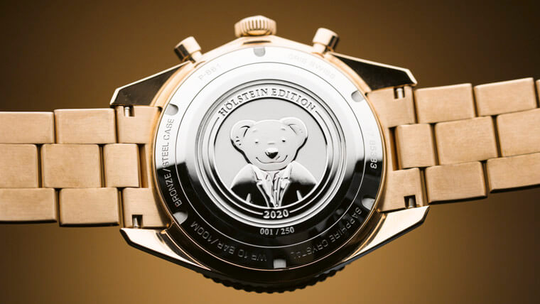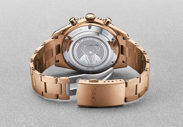 说到表背,原本ORIS青铜表大概有两种样式,一种是透明底盖(Big Crown),另一种搭配实底盖的话则会在底盖上鐫刻潜水员头盔(Divers Sixty-Five),照理说Hölstein 2020限量计时码表属于后者,底盖应该会是潜水员头盔图案,但别忘了这款表带有独特纪念又限量的意义,所以你会惊喜的发现手表底盖刻上的反而是一只熊的图案!小熊图案有点像是ORIS的吉祥物,所以看到它不会很意外,但意外的是为什麼品牌会选择在这款纪念表上鐫刻这种带点童趣的图案?关于这点,Rolf Studer先生则是表示他们刻意放上这只可爱的小熊道理不难解释,因为佩戴手表就是要让自己开心,而小熊图案乘载了许多人小时候的美好回忆,加上它也具有品牌代表性,因此在这款纪念表上才会出现这个乍看好像有点突兀的图案,其实背后是有深意的。