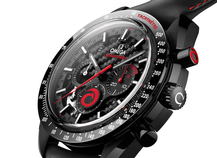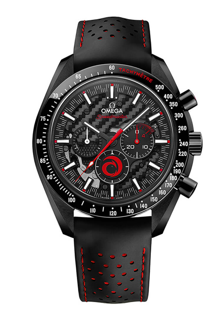 新款超霸月之暗面Alihghi联名表以黑色氧化鋯陶瓷打造表壳,包括表圈、计时按把与表冠等也都是以陶瓷制成,其中一枚计时按把上还可看到以红色清漆勾勒的Alihghi船队Logo。另外手表配置的穿孔橡胶表带上也特别用红色缝线固定两侧,黑红配色是Alihghi船队的代表性视觉元素,从中也衍生出追求速度的热血意象。