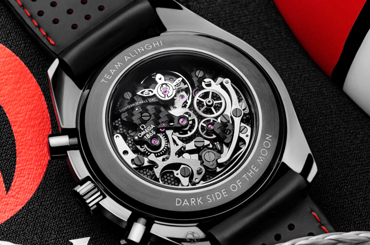 翻到表背,透明底盖下呈现的1865机芯和一般登月表搭载的1861或1863机芯在细节上有明显的不同,这是因为欧米茄从Alihghi船队的TF35双体船碳纤维船身挖掘出新想法,品牌以雷射烧蚀技术分别在机芯的机板与桥板上刻画出类似碳纤维的编织纹理,要注意欧米茄并非用碳纤维材质来制作机芯,只是让机芯的外观看起来很像碳纤纹常见的纹路。至于机芯本身的规格则如同1861或1863机芯,如动力储存一样是48小时且同为手动上链机制。