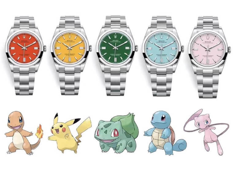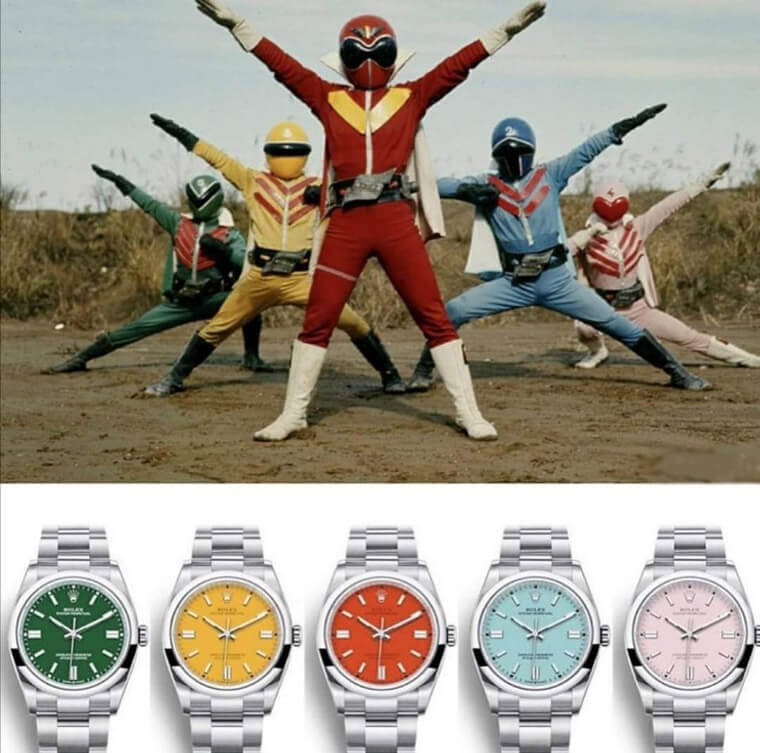 而在Oyster Perpetual的部分,2020年由于劳力士在原本的太阳纹光线面盘之外,新添5种顏色的漆面面盘,这下这糖果粉红色、绿松石、黄色、珊瑚红色及绿色纷纷成了表友kuso的对象,有人觉得5色漆面看起来很像早期日本的《金刚战士》(日本是称《恐龙战队兽连者》)的队员制服。另外也有表友认为Oyster Perpetual新色很像神奇宝贝裡的角色,包括珊瑚红色代表小火龙、黄色像皮卡丘、绿色是妙蛙种子、绿松石则像杰尼龟,而糖果粉红色让人想到梦幻等等。