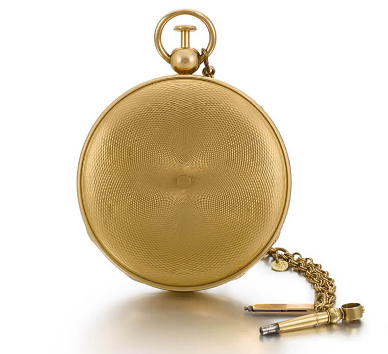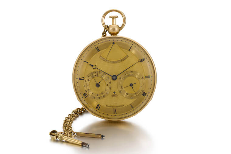 怀表具有Earnshaw天文钟擒纵、日期显示、动力储存显示、温度计功能,以及万年历功能甚至是三问功能,而且还配置自动上链系统,复杂度和佩戴便利性在问世当时都是一流。表款预估价为250,000~350,000英镑。
