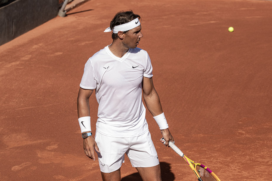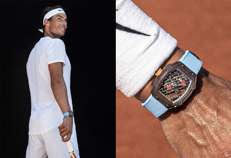 Nadal打球时有个比较特别的习惯在于他会戴着手表下场打球,通常我们会觉得网球运动剧烈的跑动会对手表造成影响,但是Nadal戴的是RICHARD MLLLE苦心研发的顶级手表,不只外观炫目、材质先进,品牌替Nadal打造的联名款也都是陀飞轮以上的复杂功能组合,重点是他们家的手表强调高度耐用性,所以这几年常看到Nadal佩戴RICHARD MLLLE手表陪伴他夺下一座又一座的冠军。包括2019年的法网和美网等大满贯赛事,Nadal都是佩戴品牌为他创作的第四款联名表——RM 27-03,手表那一身红⿈⾊调的TPT®⽯英材质表壳远远看上去就超醒目的,不过这款表自从2017年推出以来不知不觉也有3年时间,2020年适逢RICHARD MLLLE和Rafael Nadal合作的第十年,因此品牌近期也终于再推出了双方最新的联名手表RM 27-04 Manual Winding Tourbillon Rafael Nadal。