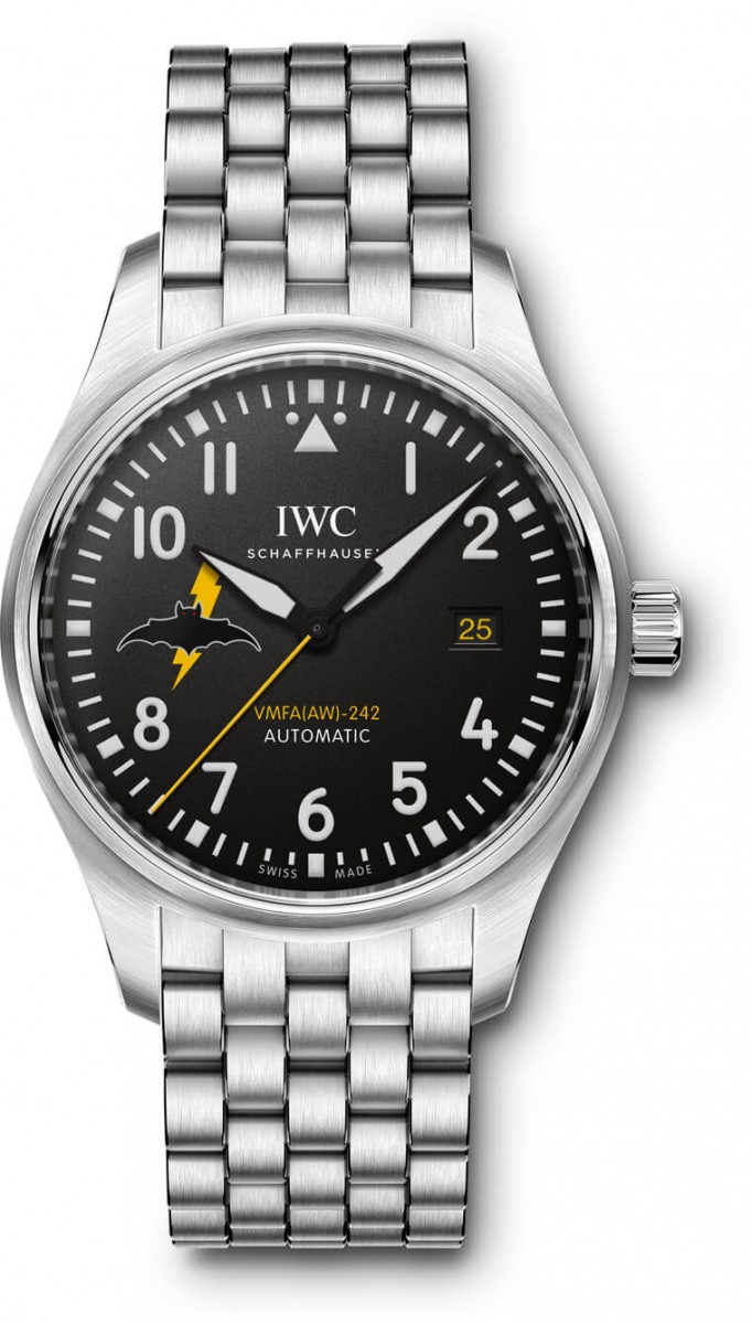 这只马克十八飞行员手表特别版是IWC万国表与美国海军陆战队中队携手打造的首款军用手表。9点钟位置可见「蝙蝠」中队徽章,搭配黄色日期显示。表背上刻有该中队的F/A-18D Legacy喷射机。VMFA – AW正式名称为「全天候攻击战斗机中队」,AW代表”All-weather”(全天候)。