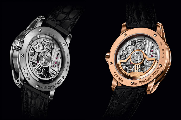 而虽然搭载的是同一枚机芯,不过爱彼为了让手表更有前后一致的视觉效果,因此玫瑰金款搭配的是22K玫瑰金镂空自动盘、白金款虽然也是22K玫瑰金镂空自动盘,但是自动盘表面有再经过镀銠处理,如此便能让机芯也能呼应表壳色调,不至于翻到表背时会突然出现一片玫瑰金色看起来有点突兀的感觉。