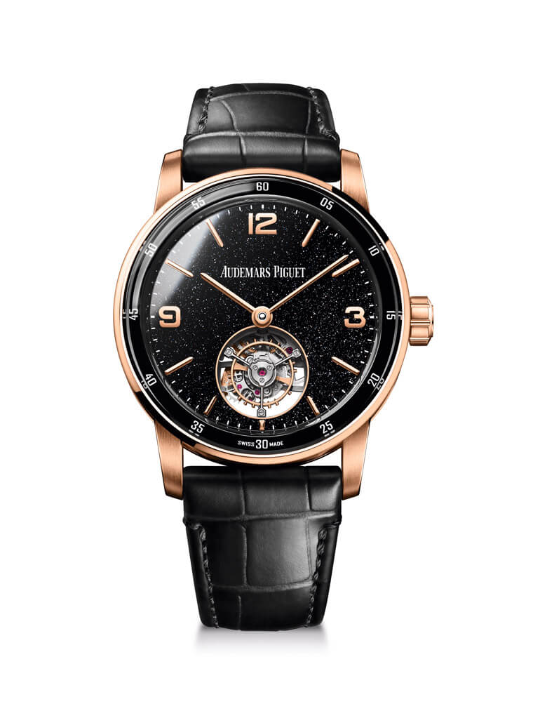 玫瑰金款是品牌首度开创出黑色砂金石珐琅面盘的先锋作品,搭配18K玫瑰金阿拉伯数字与线型时标、指针以呼应表壳材质,至于6点位置的陀飞轮还是一大视觉亮点,飞行陀飞轮由于少了顶层桥板的遮蔽,因此佩戴者在观赏陀飞轮运转的过程中可以更清楚、看得更过癮。至于品牌这次新尝试也打破了我们过往对于砂金石面盘的印象,因为以前如果採用正片砂金石作为面盘,那麼其注定只能呈现矿石本身的蓝色调,但是改用新款这种珐琅+砂金石碎片的方式,就能让手表一方面保有砂金石特有的星空联想效果,同时还多了一些色彩变化的弹性,看起来相当有特色。