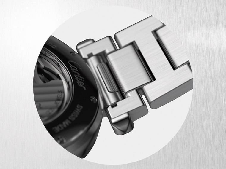 全新表带提供多种顏色与材质,各种场合都可轻松搭配。卡地亚研发的QuickSwitch系统,无论不锈钢、K金、皮革材质各式表带皆可替换使用,其隐蔽装置位于表壳下方,只需轻按一下即可启动。