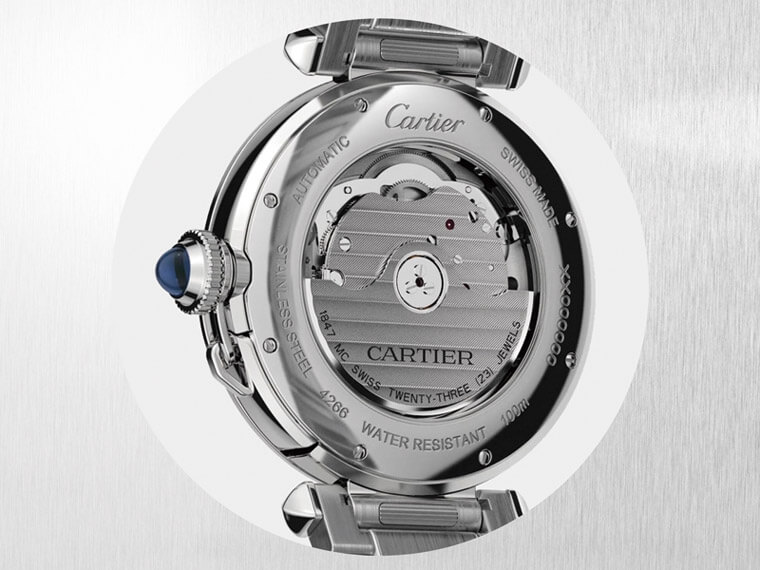 透过全新Pasha de Cartier腕表的蓝宝石水晶镜面表背,可透视其内部机芯。此一搭载1847 MC型自动上链机芯的表款,其抗磁和防水性能使其功效更加精益求精,机板打磨表现卡地亚上乘工艺,赏心悦目。