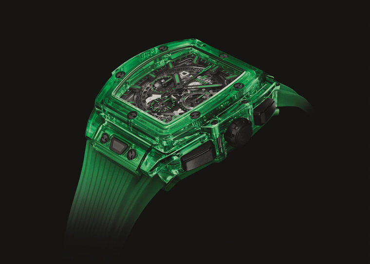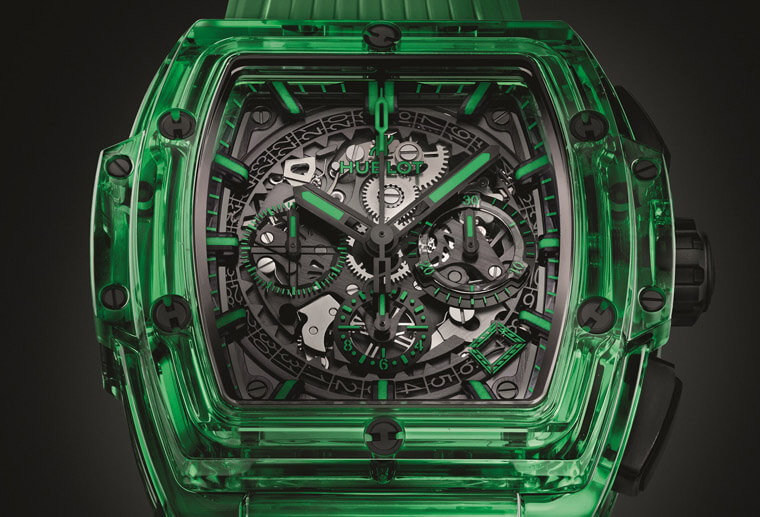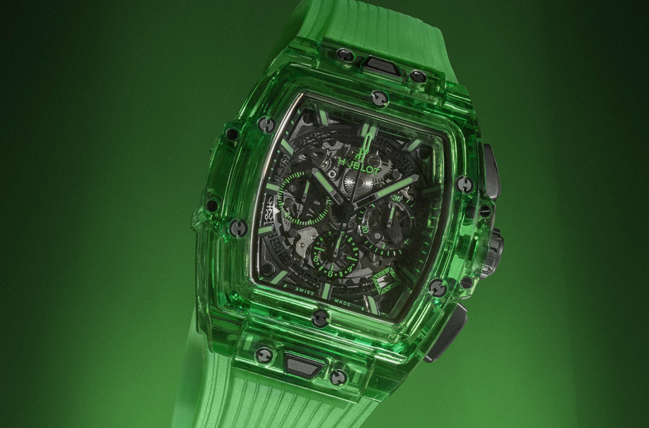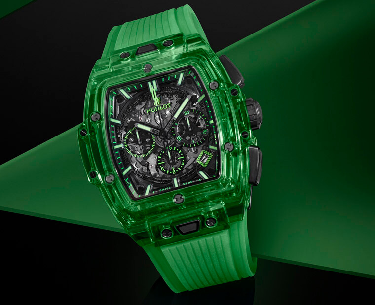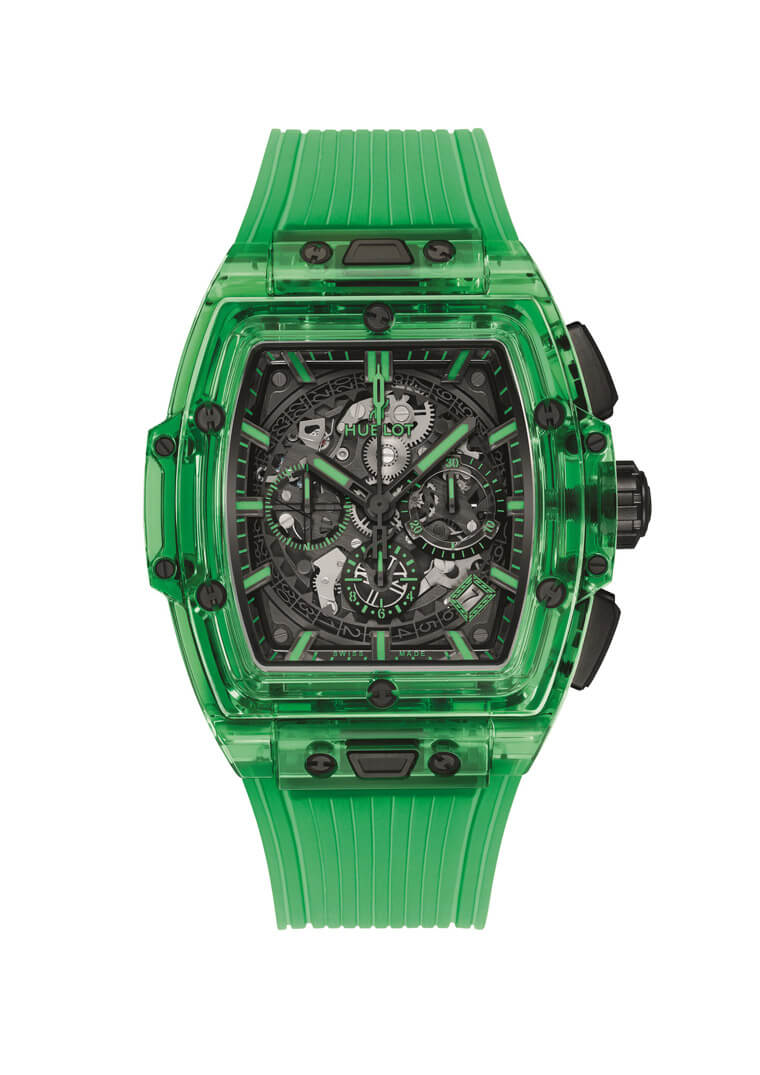 HUBLOT宇舶虽然不是表坛第一间研发出透明表壳的品牌,但是他们近年来制作出的透明壳类型绝对是最丰富的,因为宇舶并不固守在「无色透明」这种传统观点中,自从他们克服了制作透明表壳的技术关卡后,先是从无色透明进阶到黑色透明的境界,接下来一路超展开出现蓝色、红色、黄色透明表壳,到了2019年底又再接再厉发表Big Bang MP-11 Saxem这款表坛首见绿色透明表壳的奇异作品。有一就有二,品牌近期又再创作出第二款绿色透明手表——Spirit of Big Bang Saxem,这也是Spirit of Big Bang继先前黄色透明表壳后,又有一款异色透明材质的作品问世。
