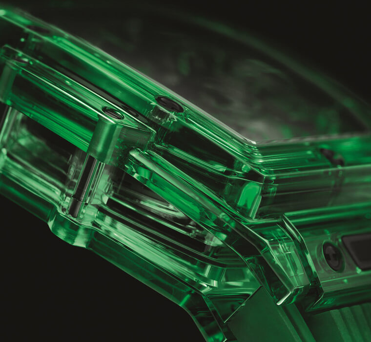 Saxem的翠绿色泽据说比翡翠还饱和,至于此类复合矿物的硬度则和钻石有得拼,换句话说这也代表了Saxem不容易加工塑型,原本无色透明表壳就已经制作不易,Saxem不只是表面看起来变成绿色如此简单,其实在制作过程中也着实让品牌花了很大一番功夫。
