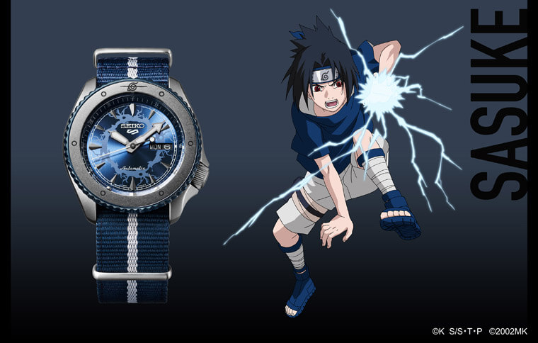 手表形似苦无造型的锐利指针、採用沉着稳重的蓝色系等,展现宇智波佐助的冷酷性格。面盘图案体现卡卡西的「千鸟」忍术闪光印象,表圈同样让人想到宇智波佐助的护额,12点钟的位置也刻有木叶忍者村的标志,就连宇智波佐助与鸣人对决时留下的伤痕也细心的划上去。佐助款有一个隐藏彩蛋在于它的表冠上密藏着宇智波一族拥有的「写轮眼」开眼时浮现在瞳孔的勾玉图案,这是7款中唯一有的设计。手表底盖也刻印有宇智波一族的家徽。