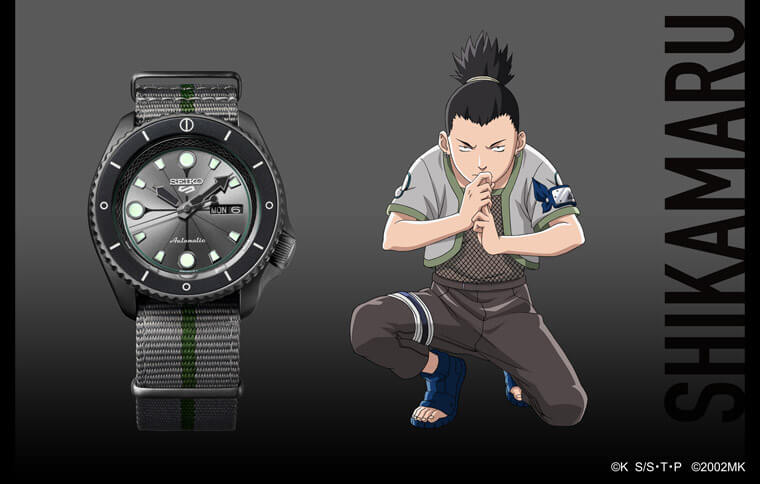 以箝制对手行动、强制对方做出与自己相同动作的「影子模仿术」为主轴,刻度上涂覆有LumiBrite环保夜光涂料,再装饰如影子般延长的黑线效果。表圈上的记号为擅长使用影子忍术的奈良一族的家徵,还有鹿丸少年时期装扮的环状耳环等。底盖一如前两款,它也刻印着主人翁奈良一族的家徽。