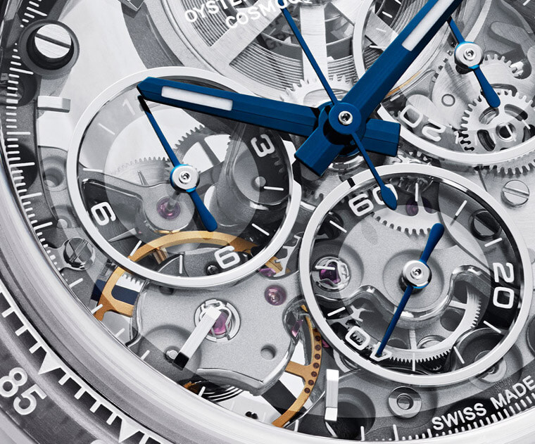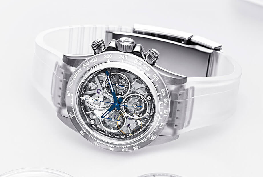 在制作过程中要使用蓝宝石水晶来打造表圈和面盘,这本身就是一件难事,因为蓝宝石水晶的质地坚硬,要加工没这麼容易,但是Artisans de Genève也不是吃素的,他们几经研究克服了材质的特性以及加工的难度,因此我们才有机会看到一款带有透明面盘和表圈的Daytona诞生。补充一提,与透明面盘搭配的是蓝钢指针,蓝色这种冷色调用来诠释手表的冰川主题相得益彰,放在”The Zinal Challenge”的面盘上看起来也很醒目。