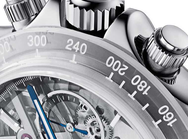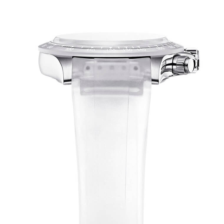表圈改由蓝宝石水晶制作,Artisans de Genève再以手工替表圈进行拋磨修饰,同时其上的测速计刻度则是填上白色顏料呼应冰川的雪白地貌。