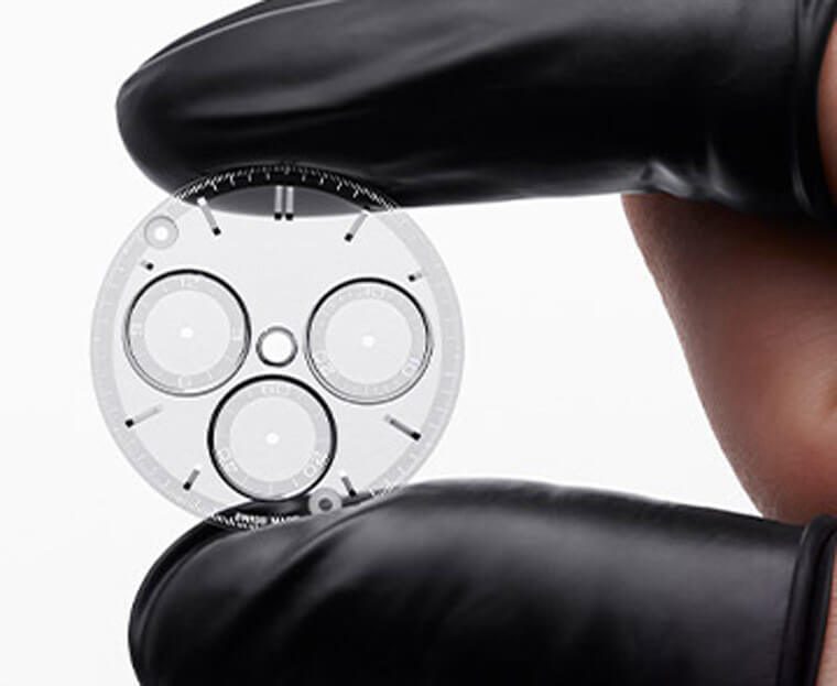 面盘和表圈一样也使用了蓝宝石水晶营造透视感,其中计时小表盘以及面盘外缘的刻度均进行了黑色偏光处理,使得表主在阅读时间时不会看得眼花繚乱,而透明面盘的好处还包括可以把4130机芯的正面看得清楚。