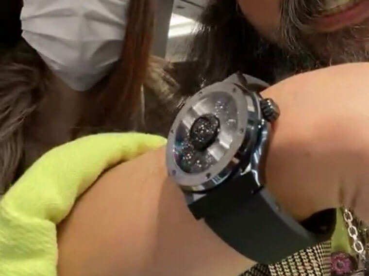 村上隆本人在拿到手表后当然就是立马戴上手把玩一番,从他在IG上Po出的直播影片中我们发现了Classic Fusion Takashi Murakami All Black实表的微笑之花花蕊部分不是设置在蓝宝石镜面下方,而是突出于镜面,这使得微笑之花的花瓣与花蕊两部分会因为有无蓝宝石镜面的覆盖而产生微妙的视觉变化。同时从大师实际佩戴手表更能感受到微笑之花花瓣旋转的那种动感。