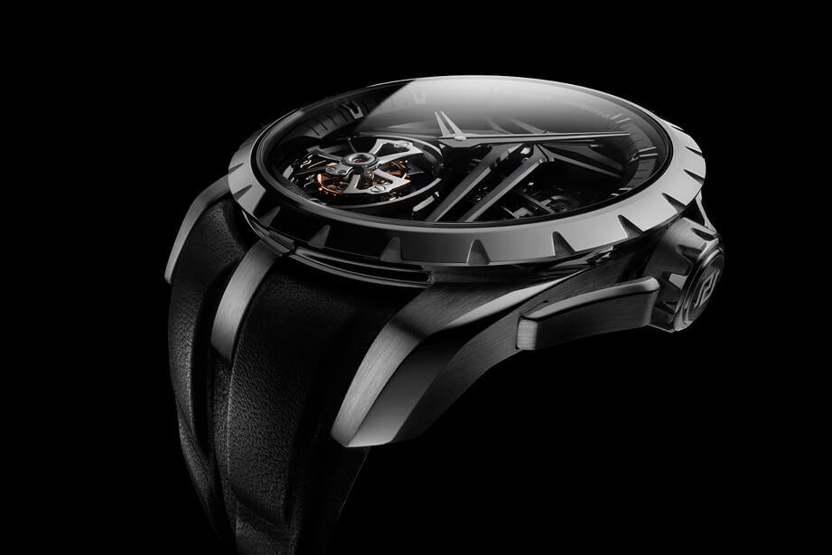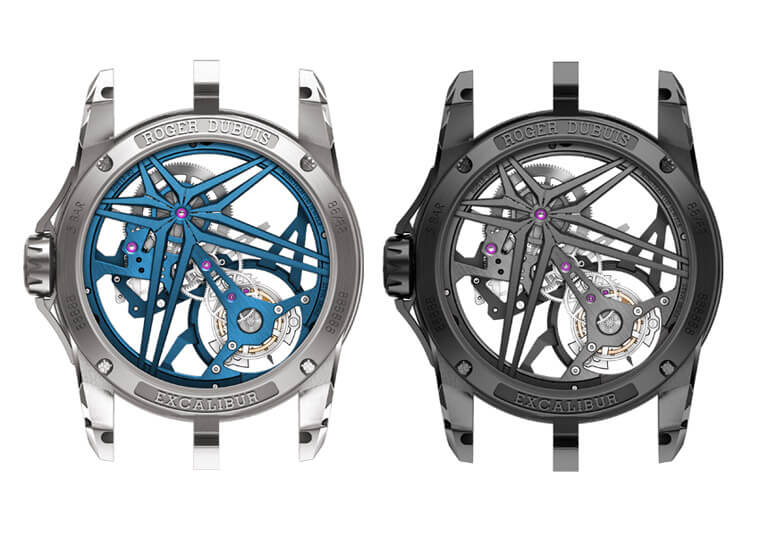 新款Excalibur飞行陀飞轮分别採用深灰DLC涂层钛金属、CarTech Micro-Melt BioDur CCMTM鈷铬鉬合金以及品牌全新开发的Eon Gold玫瑰金等三种材质制作表径42mm的表壳。Excalibur系列外观特色如三岔表耳、坑纹表圈等藉由不同材质的诠释也呈现出同中求异的个性,品牌按照表壳材质的不同,替钛金属以及Eon Gold玫瑰金款搭配黑色立体小牛皮表带、鈷铬鉬合金款则是搭配蓝色立体小牛皮表带,它们都具备表带快拆设计,让人可以轻松DIY换上不同表带转换一下心情和风格。