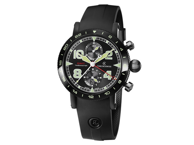 Timemaster Chronograph GMT两地时间计时码表有两款型酷黑色设计表款:首款的不锈钢表壳包围着的黑色表盘装配Super-LumiNova夜光时标及指针,第二款不锈钢表壳经极坚硬黑色类钻碳(DLC)涂层处理;两款设计的表盘佈局清晰易读,表款上的GMT字样及GMT指针以鲜红色点缀,对比非常鲜明。