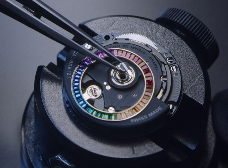 近年高级表坛颇流行彩虹圈设计,也就是在表圈上镶上不同顏色的宝石,让手表看起来五彩繽纷,极具视觉渲染力,包括劳力士、AP、宇舶和真力时等品牌皆先后发表採用类似设计的作品。2021年又有另一个品牌加入这个新兴战场,那就是让人有点意外却也不算意外的CHANEL香奈儿;因为香奈儿和前述几个品牌的定位及风格比较不同,但他们家本身的珠宝工艺水准又不在话下,也因此香奈儿打造出彩虹圈作品才会让人有这种冲突感。
