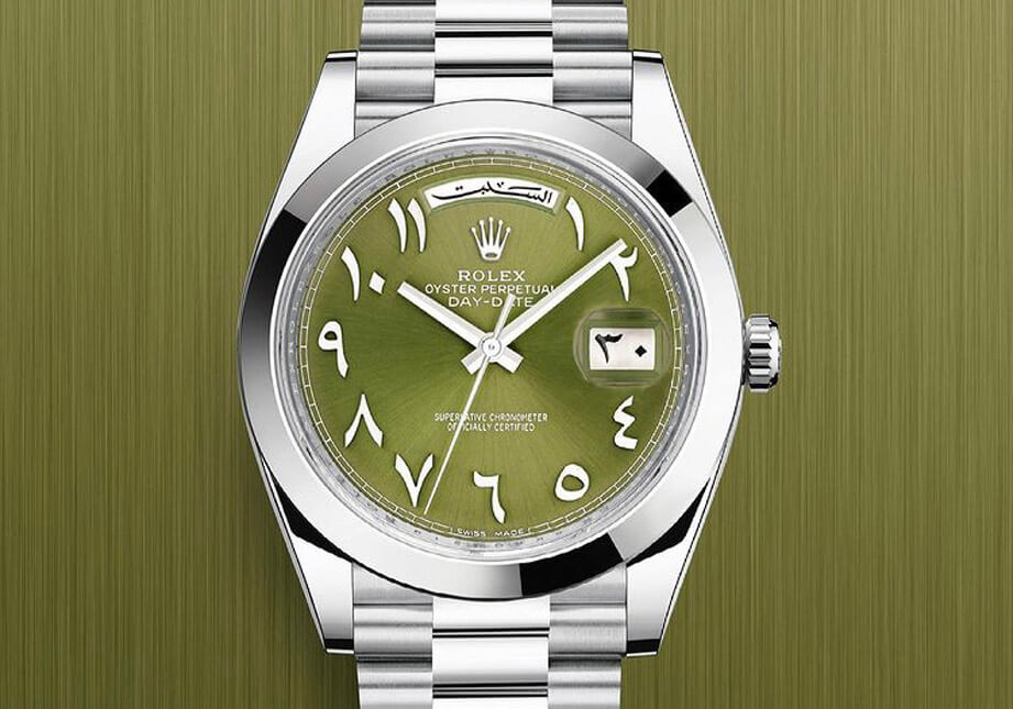 2021年劳力士所推出的Day-Date 40 “Middle East“採用铂金表壳,搭配拋光表圈和元首型表带,比较明显的变化在于面盘的橄欖绿色,劳力士是从1970年代的古董Day-Date身上获得灵感,至于其他的面盘特徵就跟过去我们看过的阿拉伯文数字面盘一样,包括时标、日期盘以及星期盘上的数字与文字都改成了(看不太懂)的阿拉伯文,除了时标因为放在固定方位比较容易辨识出来,其他日期和星期资讯除非看得懂阿拉伯文,不然戴在手上就会像在看天书一样,有看等于没看。还好这种事只要上网查查,在脑中转换一下阿拉伯文代表的意思,就算不一定真的是中东人,想要看懂也不是什麼难事。而且除了中东收藏家,对于想要追求独特性的非中东在地人而言,有时候这样的面盘反而更有吸引力。