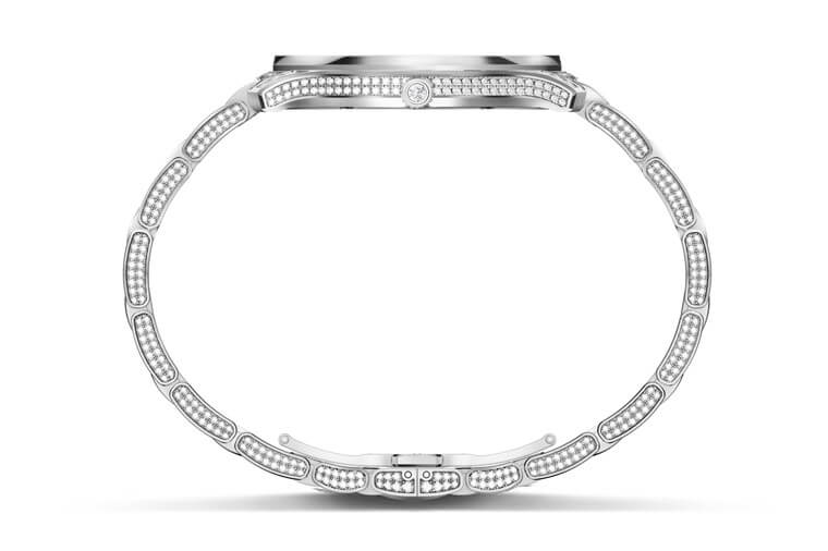 ▲即使表壳外观镶上满满钻石,手表整体的厚度也不过7.99mm,此外就连白金镶钻链带的侧边也都镶了数量庞大的满钻,夺目耀眼程度令人惊嘆。