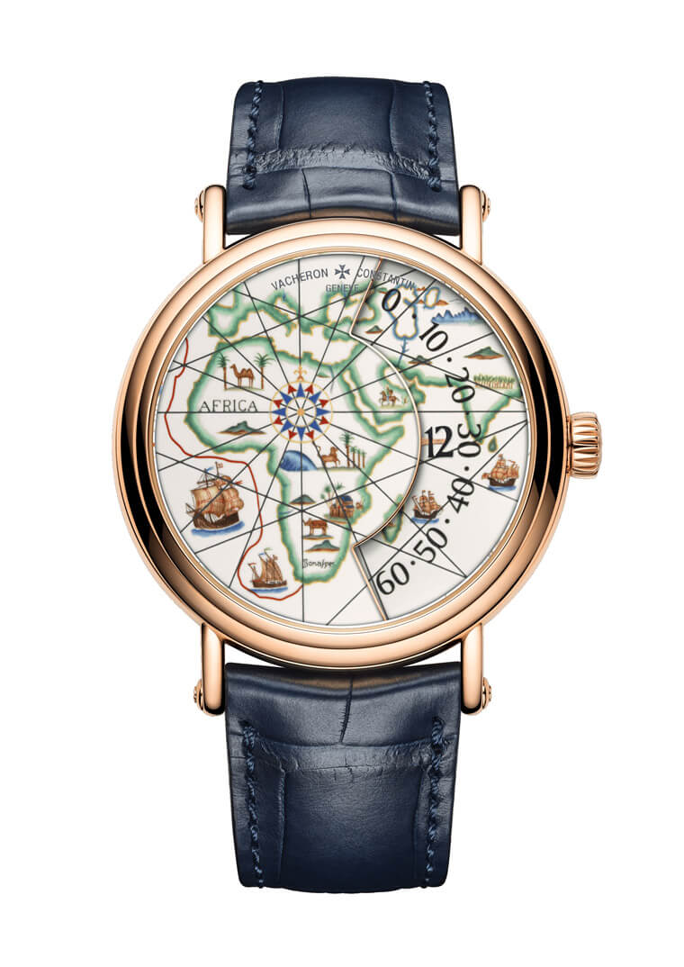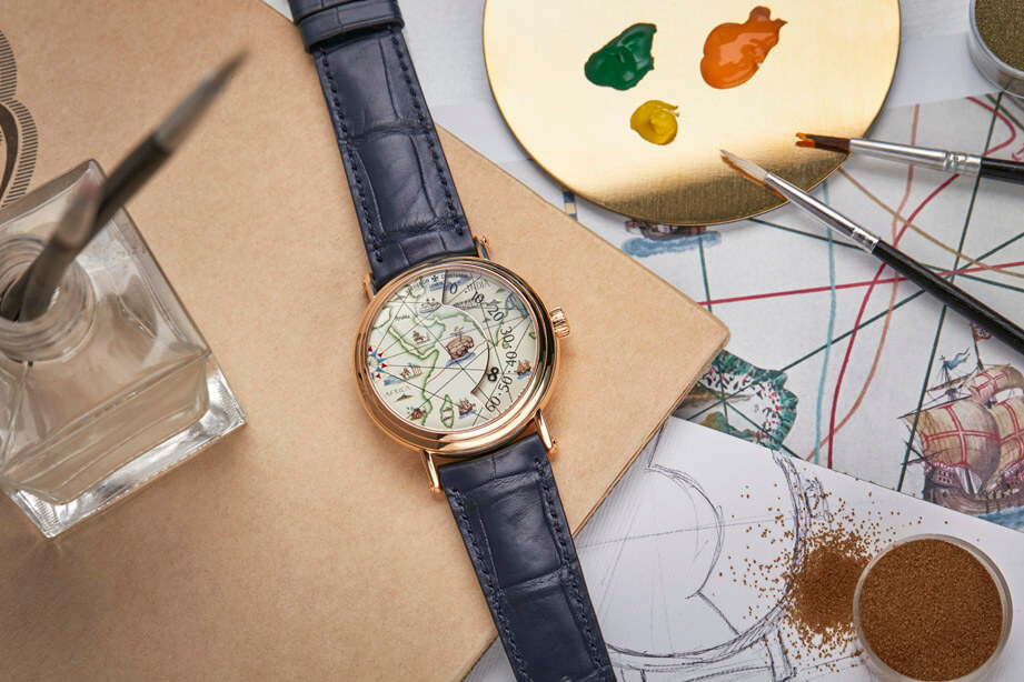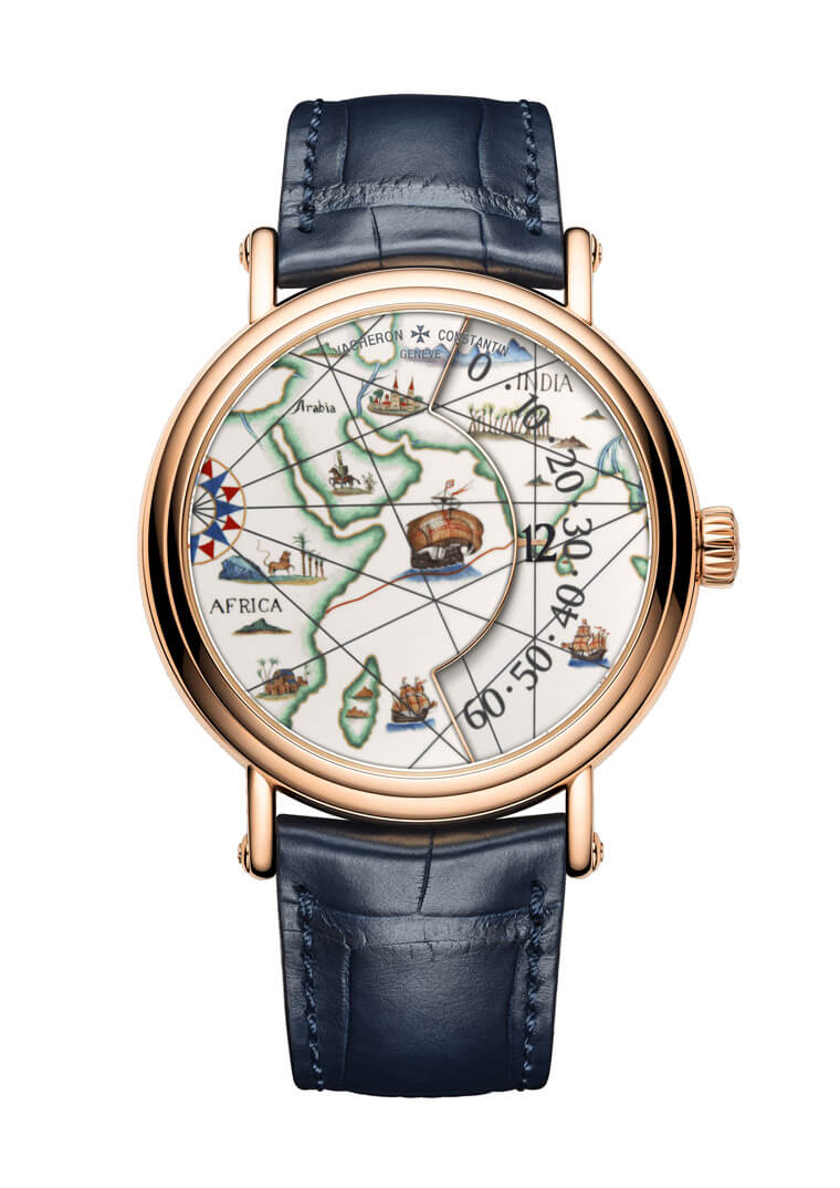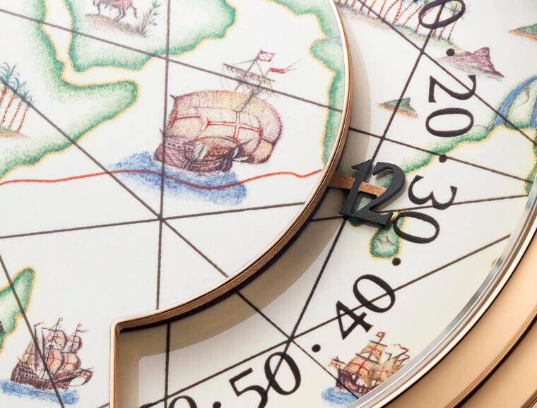 三款手表面盘都是以大明火珐琅打造,据说制作每一枚面盘都需耗时整整一个月,在摄氏800~900度的高温窑中反覆烧制,总共要历经11次上色、烧制的循环才完成最终的珐琅彩绘图案。至于江诗丹顿在面盘彩绘的图案又是什麼呢?原来品牌是用1519年绘制、现存于葡萄牙里斯本海事博物馆的《米勒地图集Miller Atlas》(馆藏的是复刻本)其中一幅地图为灵感,并分别把三位葡萄牙航海家的冒险路线呈现在手表面盘上,藉此展现当年他们勇于探索未知海洋与大陆的勇气。