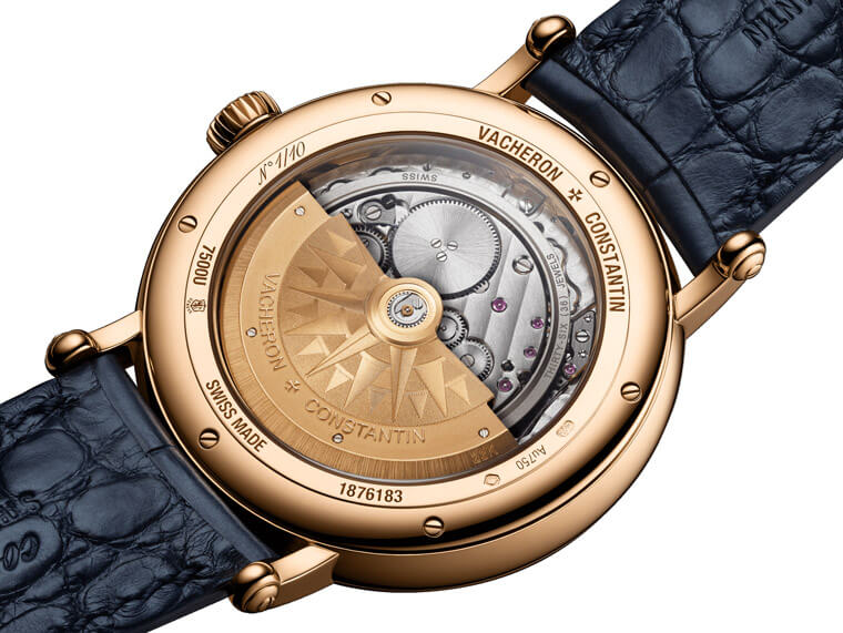 ▲透明底盖露出1120 AT自动机芯,它的自动盘以机刻工艺刻出风向玫瑰罗盘图案,这枚薄型机芯也延续江诗丹顿传统通过日内瓦印记认证。