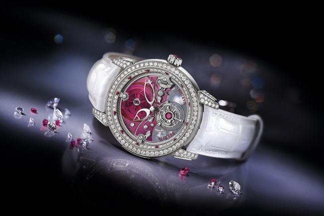 大师级作品Royal Ruby飞行陀飞轮外表轻型,採用人手以宝石精制而成,内圈时标镶有12颗红宝石,伴随48颗美钻,互相辉映。红宝石是钻石之外硬度最高的宝石,絶对是这新手表材料的信心之选。每颗红宝石都由宝石切割大师完美切割成型,打造出这系列中的41毫米铂金表壳,配上一条华丽的鱷鱼皮真皮表带及铂金摺叠带扣,相得益彰,更突显出手表的奢华之美。