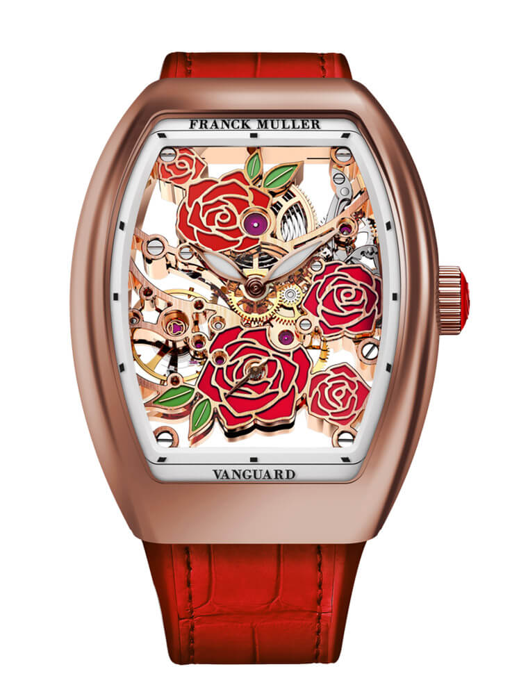 FRANCK MULLER 2021年打造全新Vanguard Rose Skeleton,特色即在于面盘饰有手绘玫瑰花图案,就像在佩戴者手腕上恣意绽放般让人看得心花怒放。