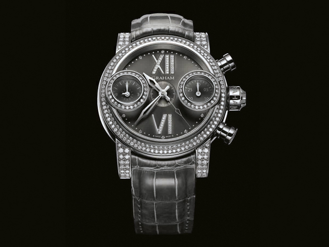 Swordfish Diamonds镶钻剑鱼的制作耗费大量工时、绝佳的镶嵌手艺,以及表圈与双透镜上209颗相同克拉、净度、色彩及切工的钻石,此外,表壳也有其独特光泽。指示时间的表盘上,则镶嵌了另外50颗钻石。表款搭载GRAHAM特制的自动上鍊机械机芯,将小秒与12小时计时盘置于同轴显示;加上30分鐘计时与中央计时秒针,成就了这只完美的计时码表。正因这是一只真正的GRAHAM手表,机芯的精密与复杂程度绝不亚于表壳繁复的镶嵌工艺。